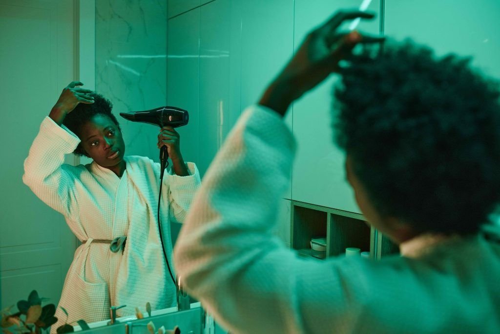 African young woman in bathrobe looking at mirror and drying her hair with hair drier in the bathroom